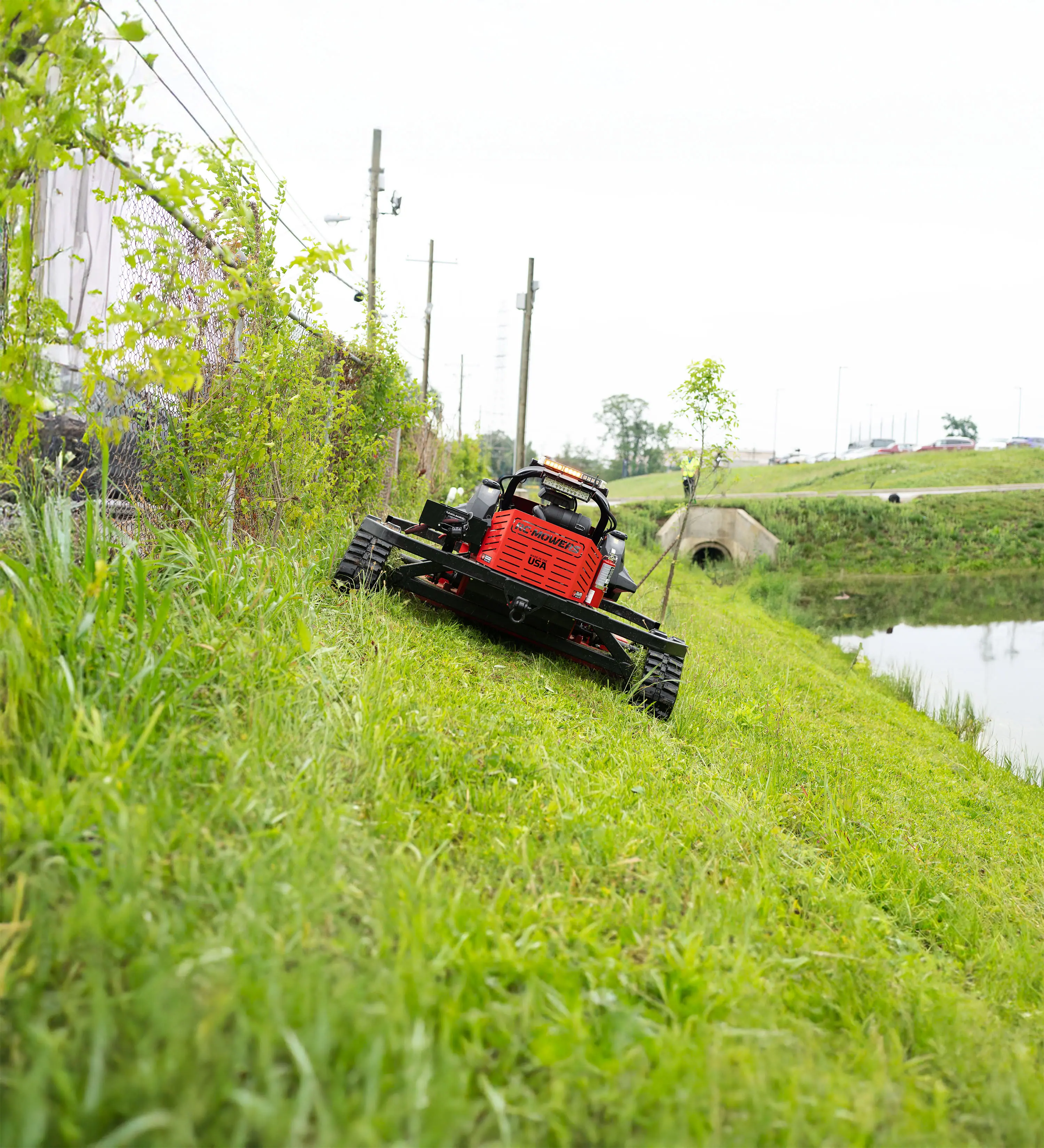 Experience mowing the smarter, safer way. Our remote-controlled stormwater basin mowers set the standard for commercial mowing, streamlining maintenance tasks to reduce labor costs while also exceeding productivity expectations. These machines are built to meet the demands of stormwater basin upkeep by clearing overgrown vegetation and mowing rugged terrain.